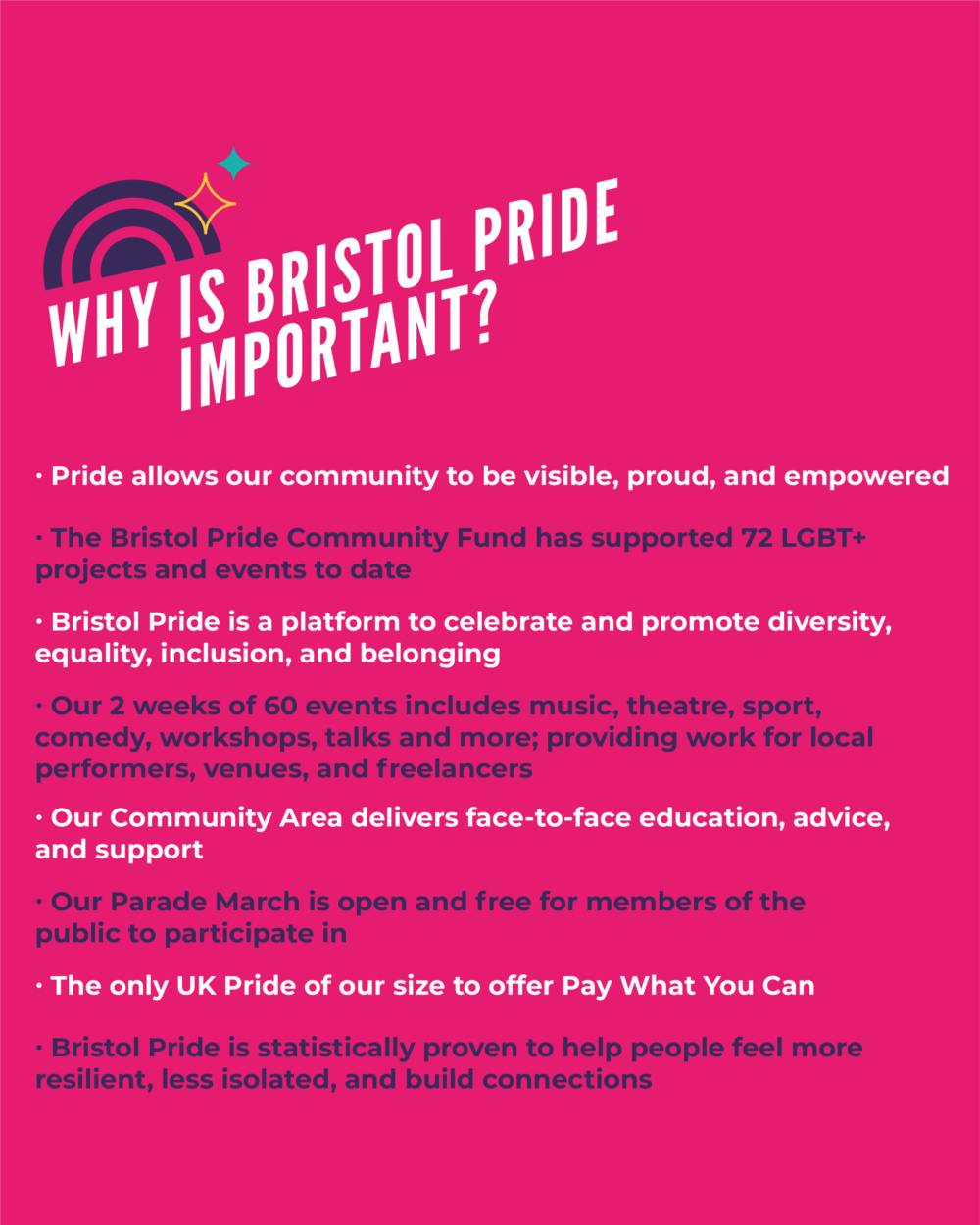 It takes a lot to make Bristol Pride happen. We’re proud to have created something special in Bristol. We’re one of the largest Pride’s in the UK but keep community at the heart of what we do. We also proud to ensure Bristol Pride remains financially accessible to everyone to take part in and enjoy.