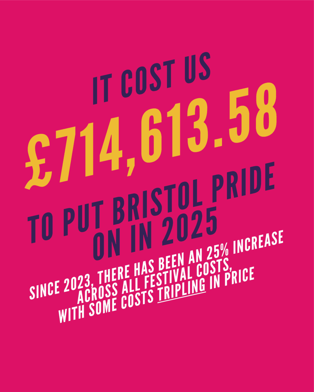 We’ve been working to keep costs down, holding an event of Bristol Pride’s size comes with responsibilities, approvals, paperwork and costs. It cost us £714,613.58 to make Pride happen in 2025 – you can a breakdown below of those costs, so you can see where your ticket money and donation go – or just take a look around at the festival and see what you’ve helped create!