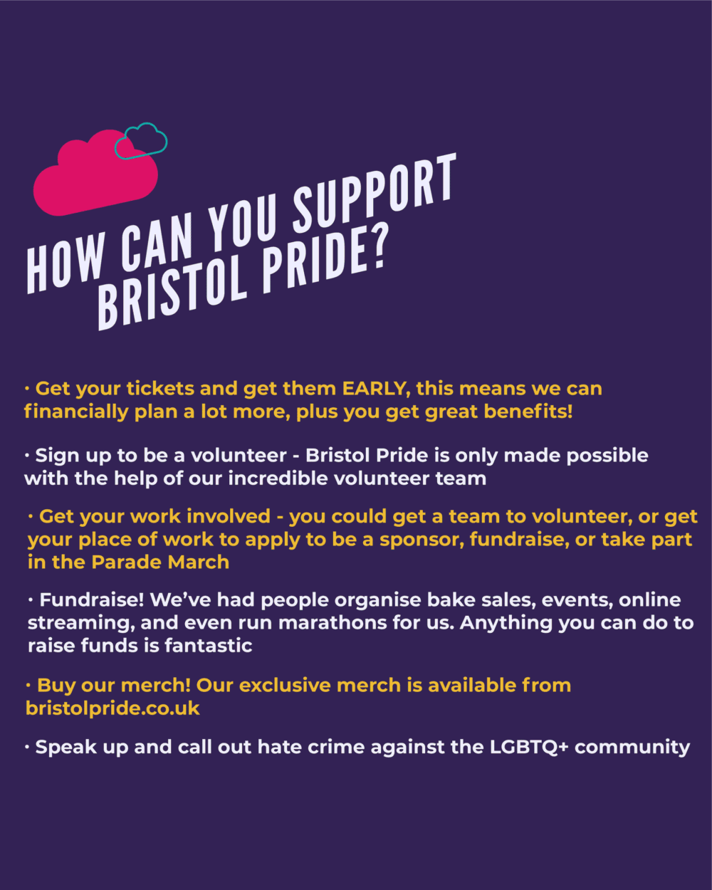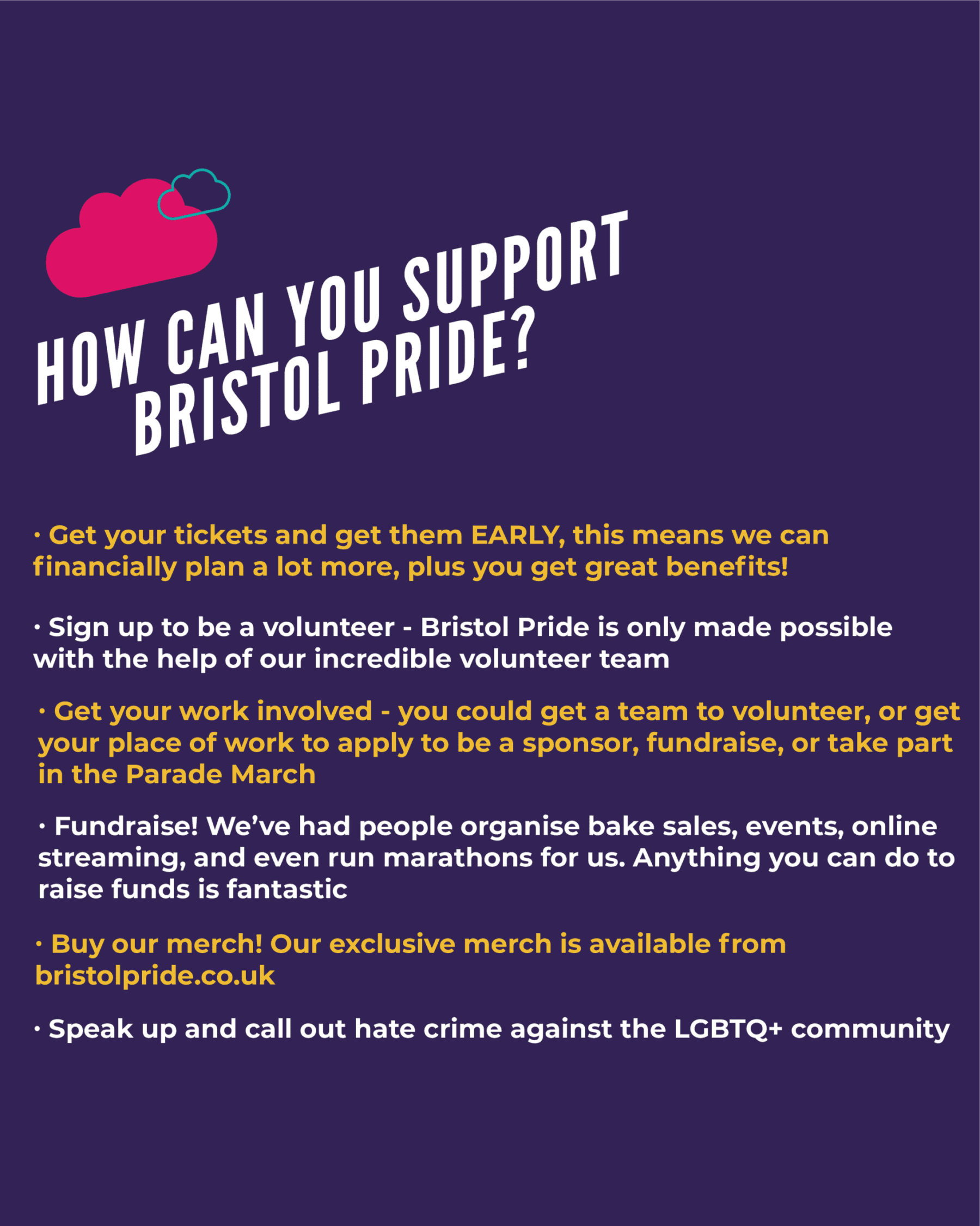 To help make Pride happen you can simply ensure you get a ticket Pride early and you can also donate or fundraise for us. By doing this, we can invest more back into the festival and keep making something truly special here is Bristol that remains independent, ethical and true to what Pride is about.